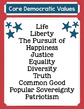 Here’s the official definition: Core democratic values are the fundamental beliefs and Constitutional principles of American society, which unite all Americans. These values are expressed in the Declaration of Independence, the United States Constitution and other significant documents, speeches and writings of the nation.